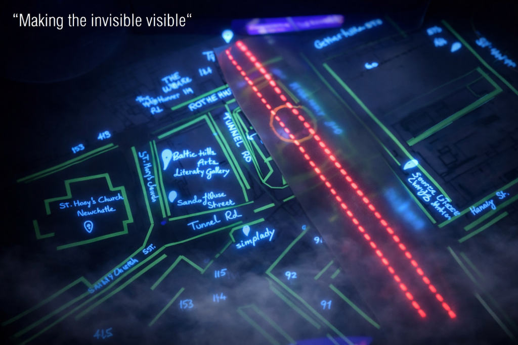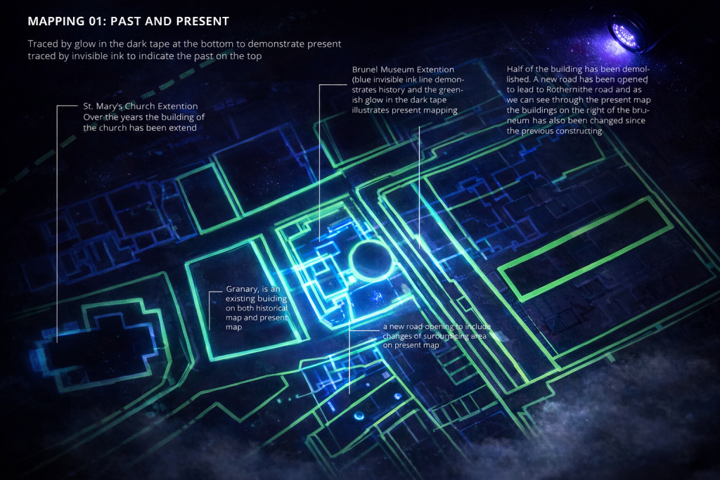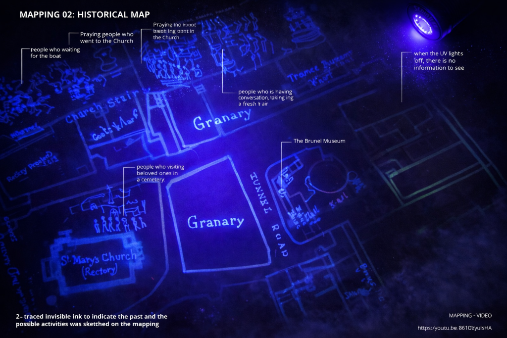 What has changed over the years Brunel Museum areas? Blue lines demonstrate the past and yellows the present. It has been used invisible ink, therefore 'the past only can be seen when the specific lights on. Tracing the truth through site analysis, and subsequently mapping it in a selected area. This is a collaborated work.