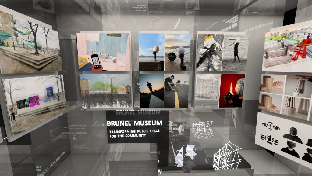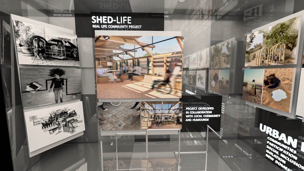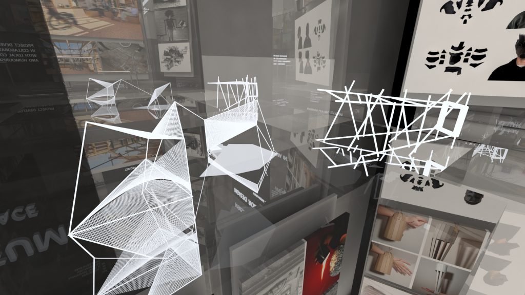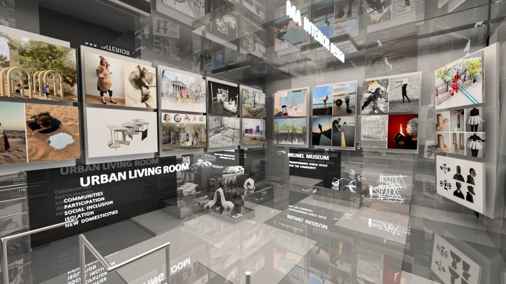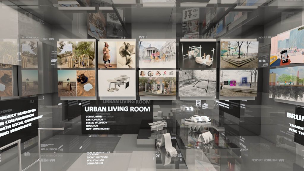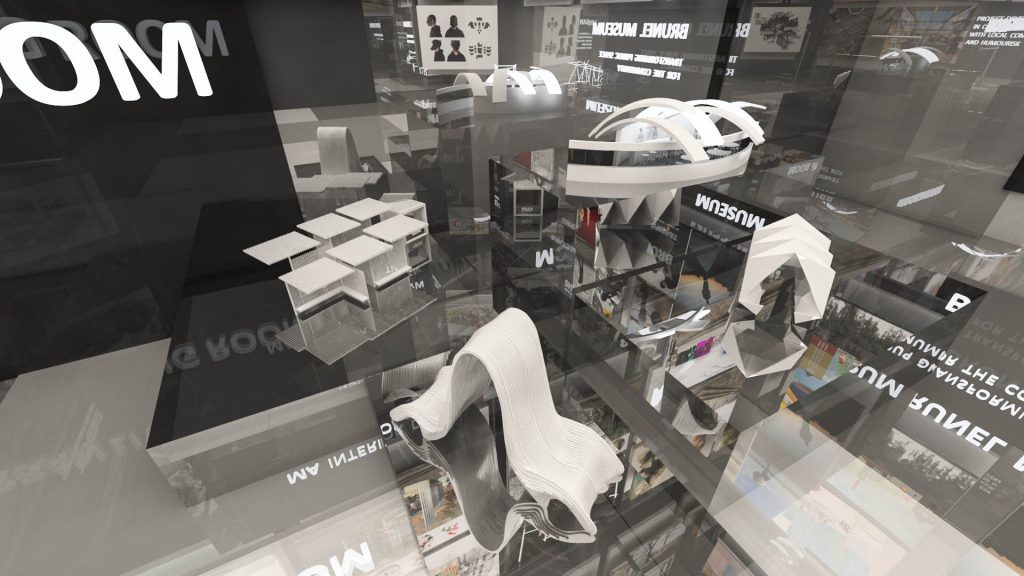 This was a competition-winning project. The main philosophy behind it stems from two words: exhibition and virtual. It is an exhibition, so the background colour must be monochrome in order to highlight the projects and their colours. Additionally, it is virtual, so people are not actually walking on the floor, allowing us to unleash our creativity and add flying texts and boards.